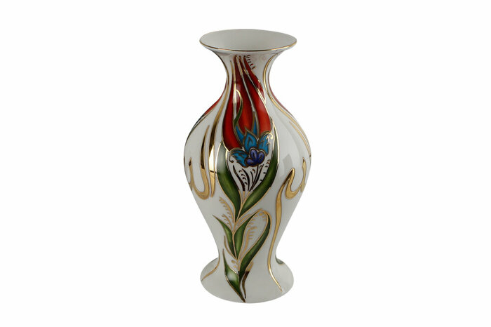 Feyz-i Hak vazo üzerinde resmedilen kültürel bir miras olan lale motifi ve hat yazısı, Osmanlı Çiniler'inde görülen motiflerden esinlenilerek el işçiliği ile kumlama tekniği kullanılarak dekorlanmıştır. Kullanım Talimatı: Bulaşık makinesinde yıkanması tavsiye edilmez, elde yıkanmalıdır.
